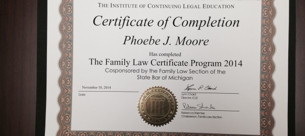 In November, 2014, Phoebe J. Moore received a Certificate of Completion in the area of Family Law issued by the Institute of Continuing Legal Education and the Family Law Section of the State Bar of Michigan. This Certificate demonstrates that Phoebe has compiled years of experience, education, and intensive study in the area of family law. It is the only certificate or acknowledgement of its kind in Michigan and issued by the industry leader in continuing education in the field of law.